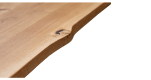 La mesa Pola apuesta por un diseño donde la comodidad y la naturalidad van de la mano. Fabricada en madera maciza de roble de 4 cm de grosor, su tapa mantiene cantos vivos que siguen la forma original de la madera, aportando una estética orgánica y haciendo que cada mesa sea diferente.